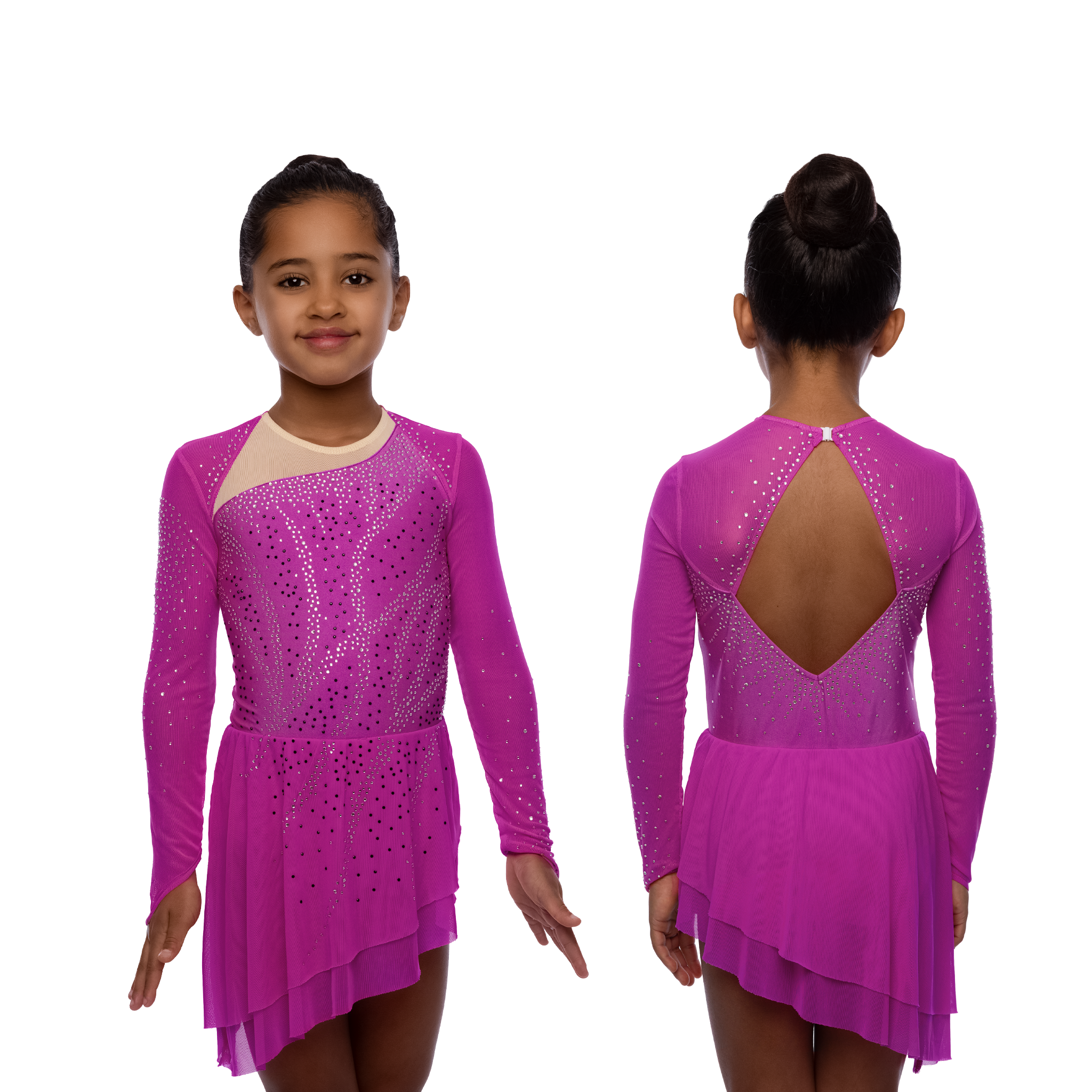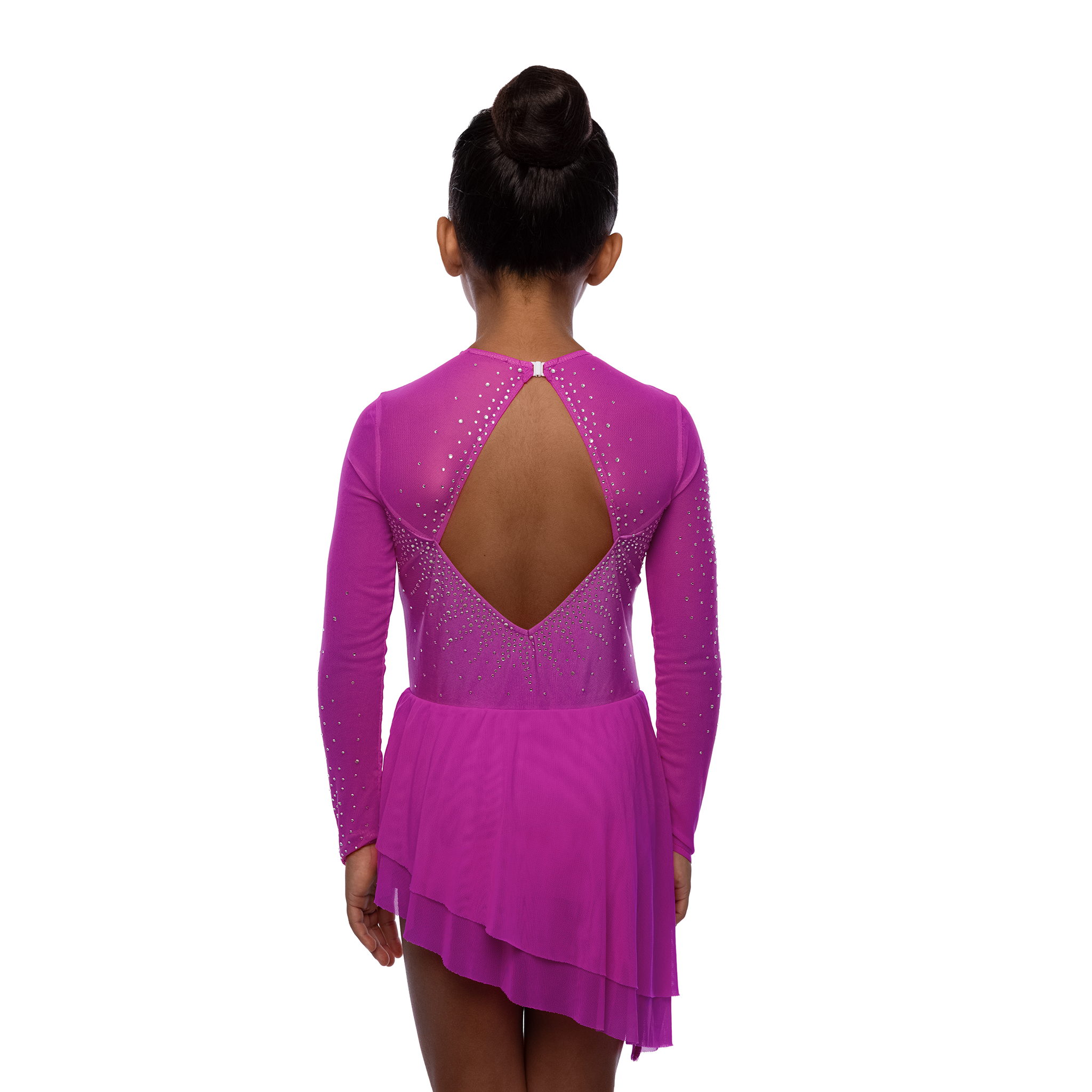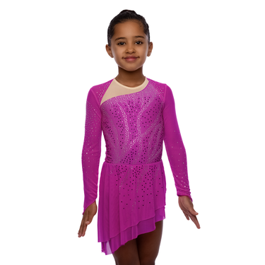 Elegantes Langarmkleid mit asymmetrischem Rock. Der besondere Schnitt und viel Glitzer unterstreichen die Ästhetik des Eiskunstlaufs.