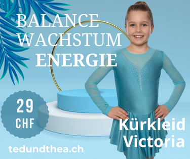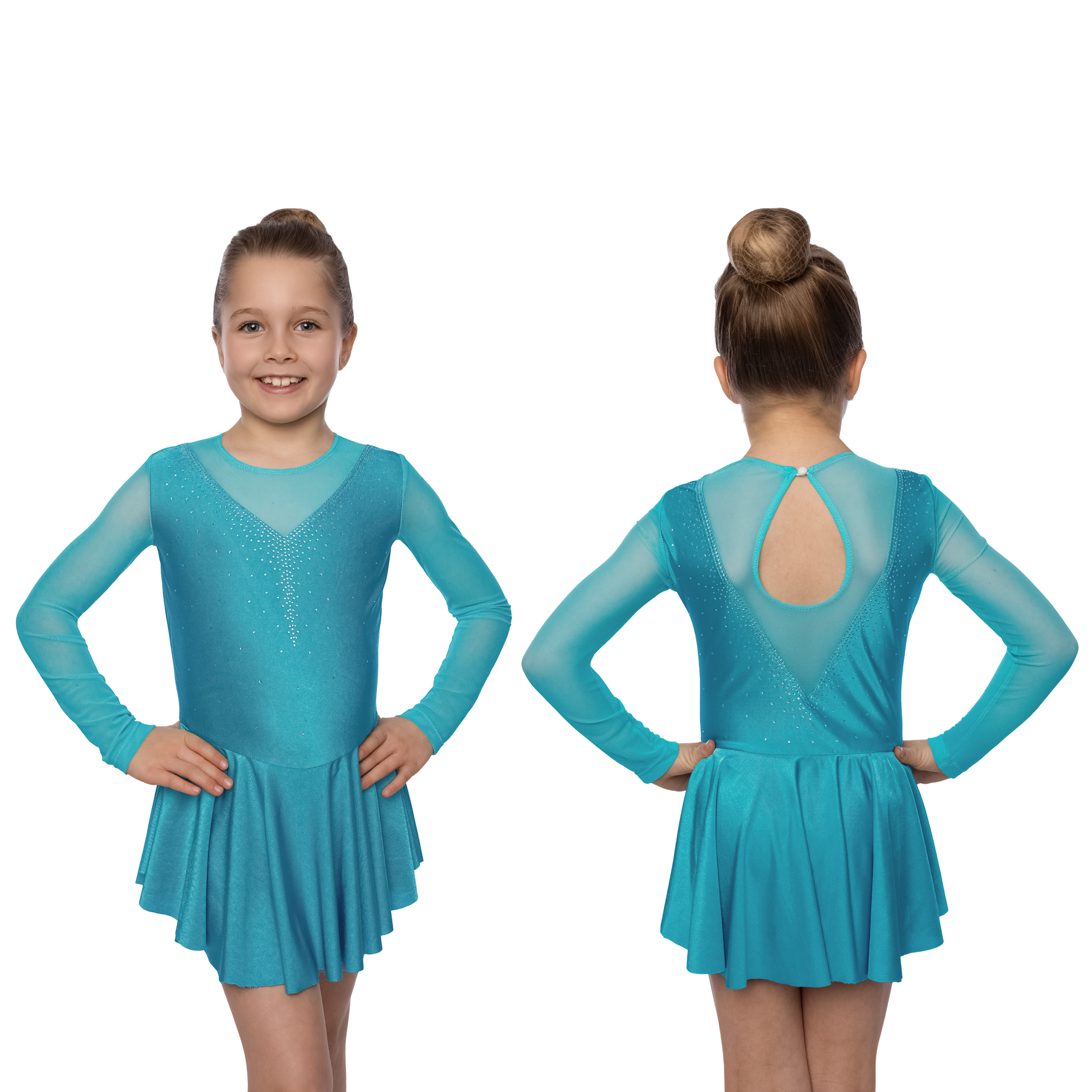Hochgeschlossener Klassiker mit feiner Glitzerdekoration. Der schön schwingende Rock betont perfekt die Pirouetten.